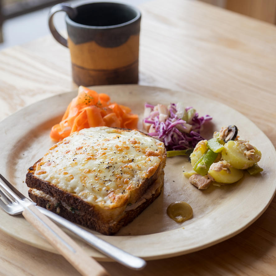 毎月どこかの1週間だけ数量限定で登場する、幻のホットサンド。ツナと香味野菜、チェダーチーズを挟み、香りと旨味、そしてカリッと焼かれたパンの食感を楽しむ絶品サンドイッチです。